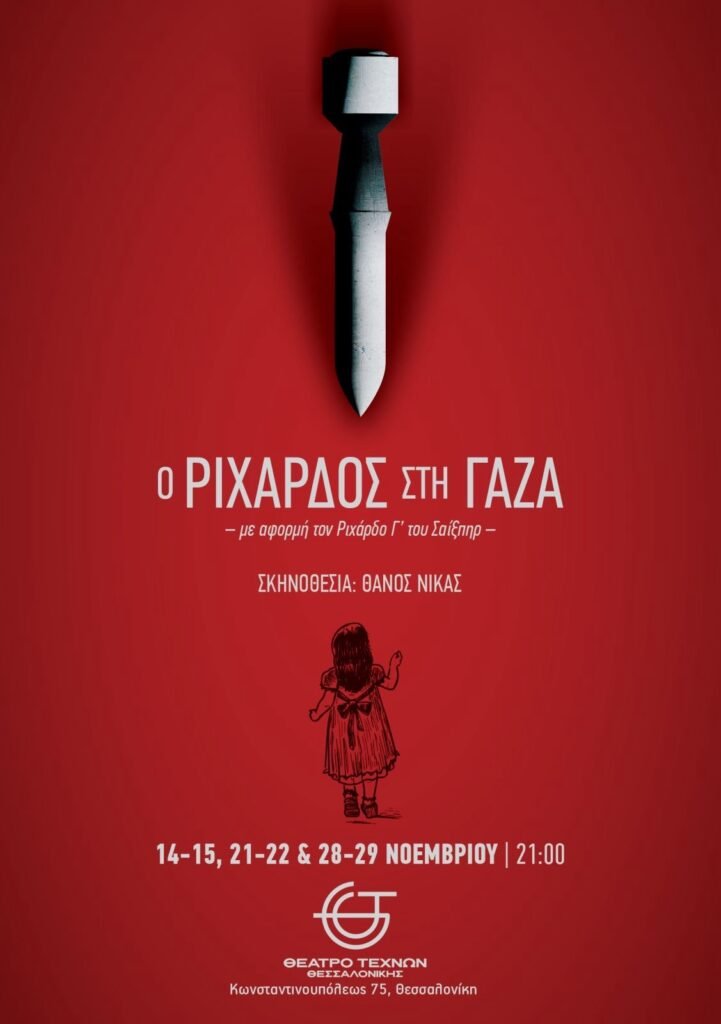 Η θεατρική οµάδα Ars Moriendi Theater Group παρουσιάζει το έργο «Ο Ριχάρδος στη Γάζα» σε παραγωγή του Θεάτρου Τεχνών Θεσσαλονίκης και της Ars Moriendi Theatre Group, µια παράσταση – µαρτυρία που συνδέει το κλασικό ρεπερτόριο µε την επείγουσα πραγµατικότητα. Η πρεµιέρα είναι προγραµµατισµένη για την Παρασκευή 14 Νοεµβρίου στο Θέατρο Τεχνών Θεσσαλονίκης, για περιορισµένο κύκλο παραστάσεων.